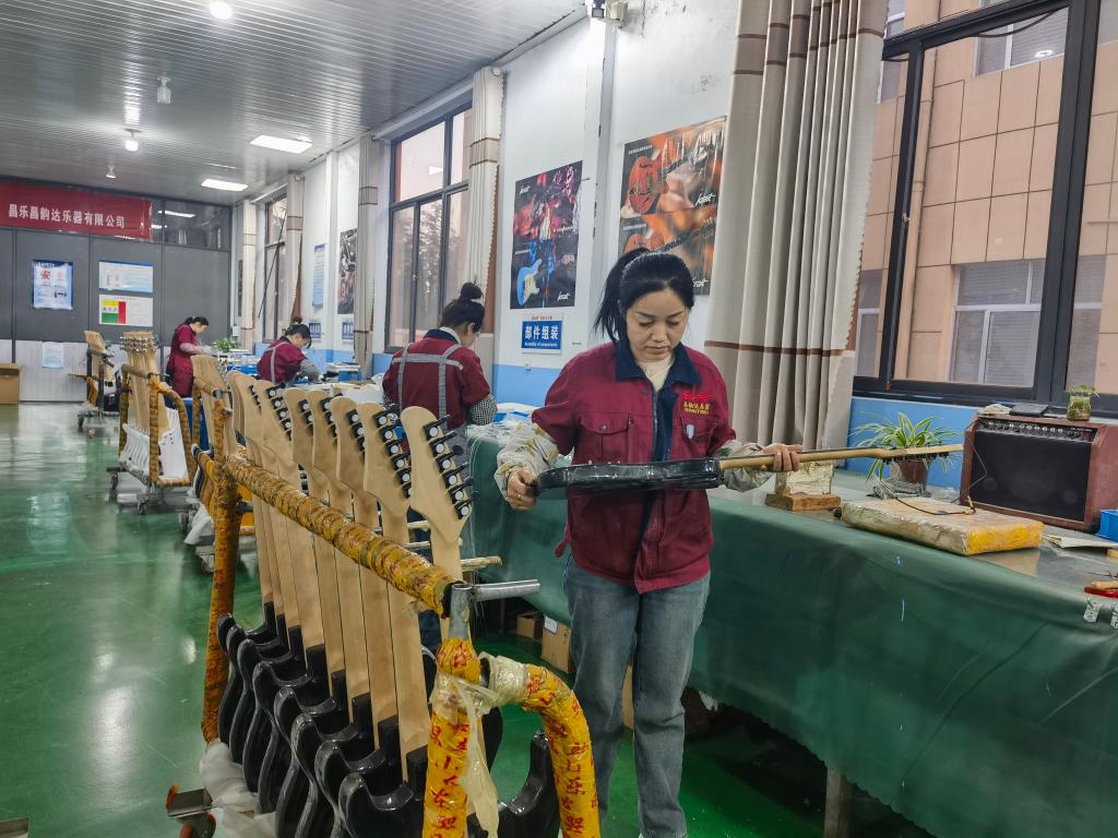 新華社濟南1月6日電(記者王念、王志、吳飛座)全球每三把電吉他中,就有一把產(chǎn)自這里!在山東省濰坊市昌樂縣鄌郚鎮(zhèn),每天,來自北美、非洲等地的木材,與我國浙江、廣東等地的音樂配件,在這里“風(fēng)云際會”。在制琴匠人的精雕細(xì)琢下,化作一把把奏出美妙音符的電吉他。然后,再漂洋過海,走向世界各地……