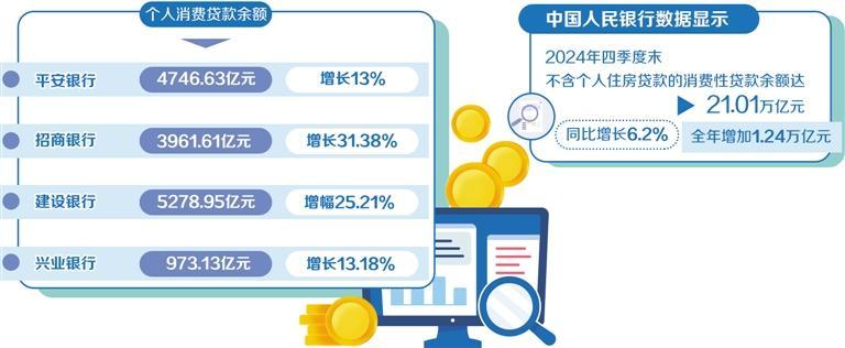 2024年,上市銀行零售業(yè)務(wù)普遍進(jìn)入調(diào)整期,消費(fèi)貸業(yè)務(wù)增長(zhǎng)強(qiáng)勁。在擴(kuò)內(nèi)需、促消費(fèi)的背景下,消費(fèi)貸成為零售業(yè)務(wù)的新增長(zhǎng)點(diǎn)。中國(guó)人民銀行數(shù)據(jù)顯示,2024年四季度末,不含個(gè)人住房貸款的消費(fèi)性貸款余額達(dá)21.01萬(wàn)億元,同比增長(zhǎng)6.2%,全年增加1.24萬(wàn)億元。多家銀行在2024年年報(bào)中披露的個(gè)人消費(fèi)貸款數(shù)據(jù)有明顯增長(zhǎng)。其中,平安銀行個(gè)人消費(fèi)貸款余額4746.63億元,同比增長(zhǎng)13%;招商銀行個(gè)人消費(fèi)貸款余額3961.61億元,較上年末增長(zhǎng)31.38%;中國(guó)農(nóng)業(yè)銀行含信用卡在內(nèi)的個(gè)人消費(fèi)貸款余額1.3萬(wàn)億元,新增2943億元,增速28.3%;中國(guó)建設(shè)銀行境內(nèi)個(gè)人消費(fèi)貸款余額5278.95億元,增幅25.21%;興業(yè)銀行個(gè)人消費(fèi)貸款余額973.13億元,較上年末增長(zhǎng)13.18%。南開大學(xué)金融學(xué)教授田利輝表示,隨著國(guó)家提振消費(fèi)政策的出臺(tái),銀行零售業(yè)務(wù)有望逐步提速。消費(fèi)貸業(yè)務(wù)有望在政策支持下繼續(xù)增長(zhǎng),成為銀行重要的利潤(rùn)來(lái)源。