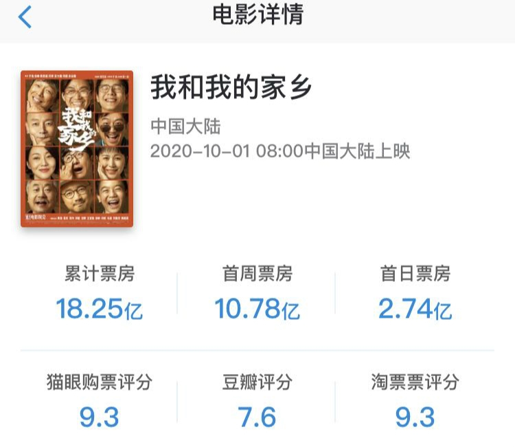值得注意的是,國(guó)慶檔期間,《我和我的家鄉(xiāng)》連續(xù)8日實(shí)現(xiàn)單日票房過(guò)億。此外,該片在貓眼和淘票票評(píng)分均為9.3,實(shí)現(xiàn)了票房口碑雙豐收。