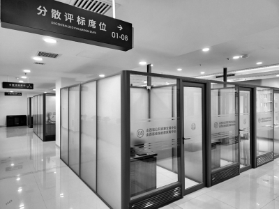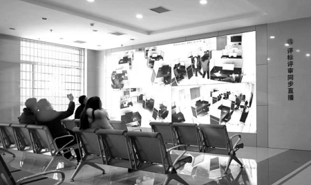 參觀完一層大廳后,工作人員將媒體觀摩團(tuán)帶到了四層一個全封閉的區(qū)域——評標(biāo)區(qū),隨機(jī)抽取的專家會在這里進(jìn)行評標(biāo)工作。代表們首先是被一系列的科技防范“硬措施”所震撼,人臉識別身份核驗機(jī)、金屬探測門防范冒名頂替,通信設(shè)備存儲柜、文件傳送智能機(jī)器人阻斷不必要的溝通,軌跡定位卡、電子呼叫系統(tǒng)、電子門牌等技術(shù)的應(yīng)用實現(xiàn)了對交易人員身份類別權(quán)限的精準(zhǔn)管控……還有全方位、超高清、永久保存的監(jiān)控設(shè)備,實時對外直播的電子大屏,實現(xiàn)了嚴(yán)密管控、處處震懾。