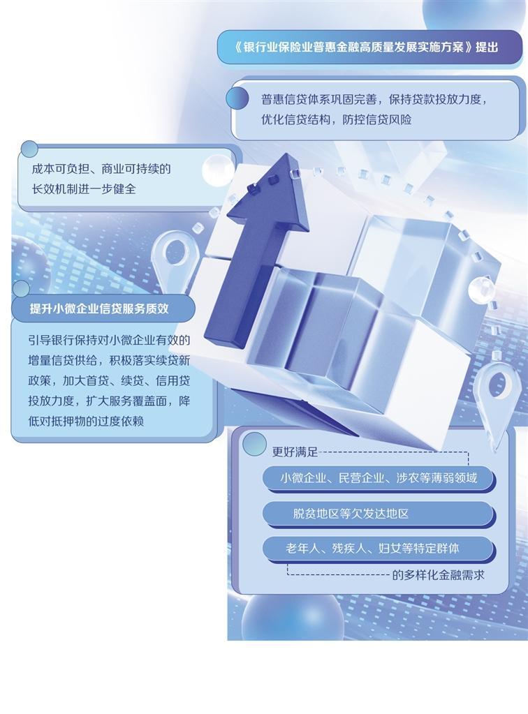 □ 本報(bào)記者 勾明揚(yáng) 近年來(lái),我國(guó)普惠金融發(fā)展取得長(zhǎng)足進(jìn)步,金融服務(wù)的普惠性不斷提升。近期印發(fā)的《銀行業(yè)保險(xiǎn)業(yè)普惠金融高質(zhì)量發(fā)展實(shí)施方案》(以下簡(jiǎn)稱(chēng)《實(shí)施方案》)在主要目標(biāo)中提出,普惠信貸體系鞏固完善,保持貸款投放力度,優(yōu)化信貸結(jié)構(gòu),防控信貸風(fēng)險(xiǎn),成本可負(fù)擔(dān)、商業(yè)可持續(xù)的長(zhǎng)效機(jī)制進(jìn)一步健全,更好滿(mǎn)足小微企業(yè)、民營(yíng)企業(yè)、涉農(nóng)等薄弱領(lǐng)域,脫貧地區(qū)等欠發(fā)達(dá)地區(qū)以及老年人、殘疾人、婦女等特定群體的多樣化金融需求。 “雪中送炭、服務(wù)民生”是普惠金融的題中之義?!秾?shí)施方案》的印發(fā)將引導(dǎo)銀行業(yè)保險(xiǎn)業(yè)進(jìn)一步提升普惠金融服務(wù)人民群眾生產(chǎn)生活的能力和水平。 查缺補(bǔ)漏完善體系 “普惠金融的初衷是為社會(huì)所有階層和群體提供金融服務(wù),實(shí)現(xiàn)經(jīng)濟(jì)的包容性增長(zhǎng)?!闭新?lián)首席研究員董希淼告訴記者,在過(guò)去幾年普惠信貸規(guī)??焖僭鲩L(zhǎng)、資產(chǎn)質(zhì)量壓力增大的情況下,金融機(jī)構(gòu)繼續(xù)推動(dòng)普惠金融特別是普惠信貸高質(zhì)量發(fā)展時(shí),一定程度上存在內(nèi)生動(dòng)力不充足的問(wèn)題,也存在外部激勵(lì)約束作用發(fā)揮不充分的問(wèn)題。 中國(guó)郵政儲(chǔ)蓄銀行研究員婁飛鵬也表示,在發(fā)展普惠金融過(guò)程中,存在一些群體的合理金融需求特別是融資需求得不到有效滿(mǎn)足以及普惠金融服務(wù)不夠優(yōu)惠的問(wèn)題。為此,需要重點(diǎn)圍繞滿(mǎn)足客戶(hù)群體合理融資需求的目標(biāo),從豐富抵質(zhì)押物類(lèi)型、創(chuàng)新信用類(lèi)貸款產(chǎn)品、利用數(shù)字技術(shù)線(xiàn)上作業(yè)降低金融服務(wù)成本等方面,為廣大客戶(hù)提供優(yōu)質(zhì)信貸服務(wù)。 國(guó)家金融監(jiān)督管理總局、中國(guó)人民銀行有關(guān)司局負(fù)責(zé)人在答記者問(wèn)時(shí)說(shuō),《實(shí)施方案》明確,未來(lái)五年,基本建成高質(zhì)量綜合普惠金融體系,普惠金融促進(jìn)共同富裕邁上新臺(tái)階。普惠金融服務(wù)體系持續(xù)優(yōu)化,普惠信貸體系鞏固完善,普惠保險(xiǎn)體系逐步健全。 “作為3項(xiàng)重點(diǎn)工作任務(wù)之一,鞏固提升普惠信貸體系和能力的核心在于夯實(shí)基礎(chǔ)并優(yōu)化效能,這為更好發(fā)展普惠金融指明了方向。”中國(guó)銀行研究院研究員吳丹認(rèn)為,接下來(lái)需要夯實(shí)普惠信貸的現(xiàn)有基礎(chǔ),運(yùn)用大數(shù)據(jù)、人工智能優(yōu)化風(fēng)控與服務(wù)效率,增強(qiáng)風(fēng)控精準(zhǔn)性、降低運(yùn)營(yíng)成本,加強(qiáng)技術(shù)賦能對(duì)傳統(tǒng)服務(wù)短板的補(bǔ)足效應(yīng)。還需要增強(qiáng)普惠信貸服務(wù)能力,擴(kuò)展服務(wù)網(wǎng)絡(luò),提升觸達(dá)效率,適配滿(mǎn)足長(zhǎng)尾客群差異化需求的創(chuàng)新產(chǎn)品。 董希淼補(bǔ)充道,可以從體制機(jī)制、基礎(chǔ)設(shè)施、產(chǎn)品服務(wù)、考核激勵(lì)等方面采取針對(duì)性措施。比如,改進(jìn)普惠信貸服務(wù)考核體系,破解融資難和融資貴問(wèn)題;拓寬商業(yè)銀行特別是中小銀行不良資產(chǎn)處置的渠道,豐富處置方式和手段;加大對(duì)商業(yè)銀行特別是中小銀行的正向激勵(lì),同時(shí)防范信貸供給過(guò)度和資金被挪用等問(wèn)題?!敖鹑跈C(jī)構(gòu)應(yīng)根據(jù)自身的資源稟賦,選擇適合的普惠信貸服務(wù)模式。”董希淼說(shuō)。 服務(wù)質(zhì)效不斷提升 完善普惠信貸管理體系,是推動(dòng)普惠金融高質(zhì)量發(fā)展的重要一環(huán)?!秾?shí)施方案》提出,建立健全包括小微企業(yè)、民營(yíng)企業(yè)、“三農(nóng)”、重點(diǎn)幫扶群體在內(nèi)的普惠信貸體系,科學(xué)設(shè)定監(jiān)管目標(biāo),加強(qiáng)監(jiān)測(cè)督導(dǎo)。完善監(jiān)管評(píng)價(jià)評(píng)估機(jī)制、信貸政策導(dǎo)向效果評(píng)估機(jī)制,優(yōu)化指標(biāo)設(shè)置,突出實(shí)效評(píng)價(jià),強(qiáng)化結(jié)果運(yùn)用。及時(shí)修訂普惠信貸監(jiān)管制度,優(yōu)化發(fā)展環(huán)境、促進(jìn)可持續(xù)發(fā)展。 婁飛鵬認(rèn)為,這些舉措將提升金融監(jiān)管質(zhì)效,通過(guò)完善評(píng)估機(jī)制,更好地引導(dǎo)金融機(jī)構(gòu)加大普惠金融發(fā)展力度、提升發(fā)展質(zhì)量,將普惠金融高質(zhì)量發(fā)展落到實(shí)處。 作為國(guó)民經(jīng)濟(jì)重要主體,小微企業(yè)是普惠金融服務(wù)的重點(diǎn)對(duì)象?!秾?shí)施方案》明確提出,提升小微企業(yè)信貸服務(wù)質(zhì)效。引導(dǎo)銀行保持對(duì)小微企業(yè)有效的增量信貸供給,積極落實(shí)續(xù)貸新政策,加大首貸、續(xù)貸、信用貸投放力度,擴(kuò)大服務(wù)覆蓋面,降低對(duì)抵押物的過(guò)度依賴(lài)。提高小微企業(yè)融資服務(wù)定價(jià)管理能力,促進(jìn)綜合融資成本穩(wěn)中有降。 中國(guó)人民銀行發(fā)布的2025年一季度金融機(jī)構(gòu)貸款投向統(tǒng)計(jì)報(bào)告顯示,