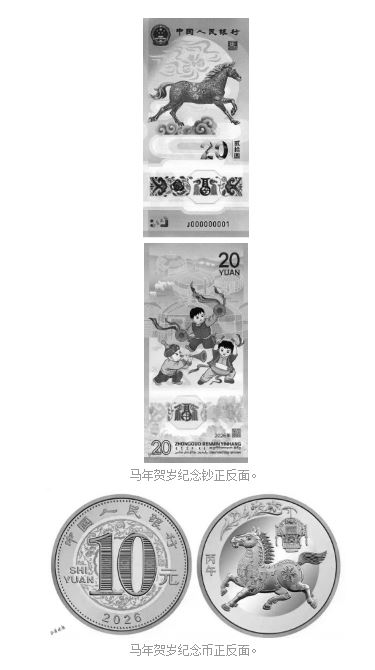 本次發(fā)行的2026年賀歲紀(jì)念幣面額10元,直徑27毫米,材質(zhì)為雙色銅合金材質(zhì),發(fā)行數(shù)量1億枚,正面為面額和年份,背面以剪紙風(fēng)格馬形象為主,輔以花燈和萱草圖案,壁面左側(cè)刊“丙午”字樣。紀(jì)念鈔面額20元,票面長145毫米,寬70毫米,采用塑料材質(zhì),發(fā)行量1億張,正面為馬造型主景,背面描繪兒童歡慶鑼鼓場景,同時(shí)融合傳統(tǒng)裝飾和多民族文字元素。二者均為我國法定貨幣,每人預(yù)約、兌換限額均為20張(枚)。