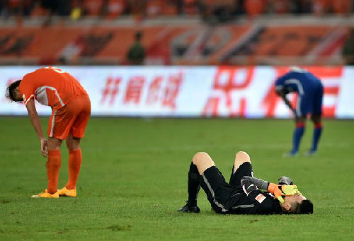 圖說(shuō):2016年7月24日,山東魯能隊(duì)守門員王大雷(下)在賽后情緒低落。 新華社發(fā)