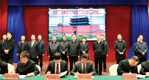 忻府區(qū)領(lǐng)導(dǎo)在簽約儀式上承諾,將繼續(xù)在市委、市政府的堅強(qiáng)領(lǐng)導(dǎo)下,全面推進(jìn)項目攻堅百日行動,堅持叩門招商、開放包容、鞠親服務(wù),堅決杜絕吃、拿、卡、要,嚴(yán)厲打擊破壞投資環(huán)境的人和事,全力營造親商、安商、富商的良好氛圍。集中人力、精力、財力,服務(wù)、指導(dǎo)、幫扶到位,落實任務(wù)、責(zé)任、措施,促開工、搶進(jìn)度,攻難點、破難題,強(qiáng)服務(wù)、治環(huán)境,發(fā)揚(yáng)“白+黑”、“5+2’’、“晴+雨”連續(xù)作戰(zhàn)精神,苦干實干,按照“九個一批”工作方案,全力解決已排查出的涉及現(xiàn)有32個項目中的51個問題,全力策劃好總投資222.16億元的華能風(fēng)光互補(bǔ)發(fā)電、上海航天光伏發(fā)電、北京富丞應(yīng)急救援工程等30個項目,全力促進(jìn)總投資41.25億元的田森匯生活購物廣場等6個項目落地,全力推進(jìn)總投資85.8億元的華能風(fēng)電、上海光伏發(fā)電等23個項目的開工建設(shè)。