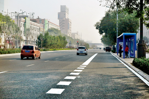 圖為10月12日早晨,改造通車的長(zhǎng)征西街街寬路闊,綠植吐翠,市民在新建的公交站臺(tái)等待公交車。魯明強(qiáng) 攝