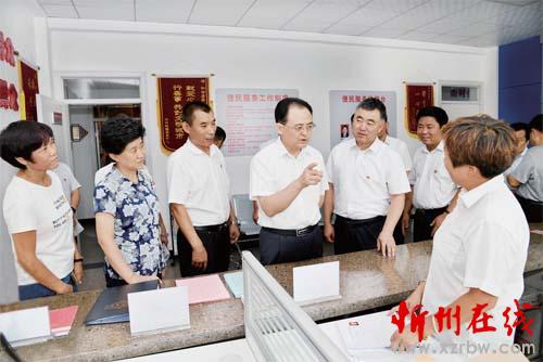 圖為省人大常委會副主任、市委書記李俊明在忻府區(qū)新建路辦事處和諧居委會調研創(chuàng)建全國文明城市情況。