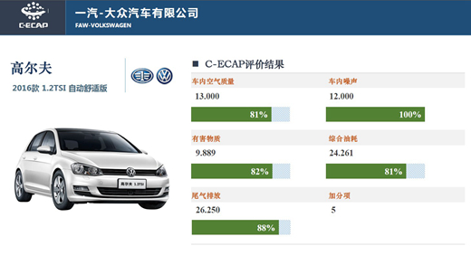 在本批次C-ECAP評價中,一汽-大眾高爾夫車型獲得截止至目前C-ECAP評價車型中的最高獎牌白金牌;廣汽傳祺是在C-ECAP中首次出現(xiàn)的中國品牌,與觀致車型一并獲得金牌;東風(fēng)本田哥瑞因在車內(nèi)噪音方面的相對得分較低,獲得銀牌。 中國汽車技術(shù)研究中心副主任張建偉向記者表示:在發(fā)改委、中宣部、科技部、財政部、環(huán)保部、住建部、商務(wù)部、質(zhì)檢總局、旅游局和國管局聯(lián)合制定了《關(guān)于促進(jìn)綠色消費的指導(dǎo)意見》,以及國務(wù)院正式發(fā)布《中國制造2025》規(guī)劃后,汽車產(chǎn)業(yè)已經(jīng)開始向綠色制造推進(jìn)。在此背景下,C-ECAP的推出將汽車在健康、節(jié)能、環(huán)保方面的品質(zhì)進(jìn)行綜合考量,其對于汽車產(chǎn)品的要求比碰撞實驗更為細(xì)致全面。今后,C-ECAP評價還將把車型拓展至新能源車與進(jìn)口車方面。