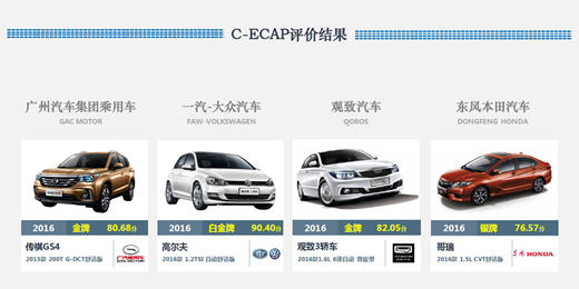 人民網(wǎng)天津3月9日電(鄂智超)日前,中國生態(tài)汽車評價(C-ECAP)新一批測試結(jié)果公布。本次共公布了四款車型,分別為一汽-大眾高爾夫 2016款 1.2TSI自動舒適版(90.40分)、廣汽傳祺GS4 2015款 200T G-DCT舒適版(80.68分)、觀致3轎車 2016款1.6L 6速自動致能型(82.05分)、東風(fēng)本田哥瑞 2016款1.5L CVT舒適版(76.57分)。其中一汽-大眾高爾夫車型獲得白金牌,廣汽傳祺GS4與觀致3轎車獲得金牌,東風(fēng)本田哥瑞獲銀牌。
