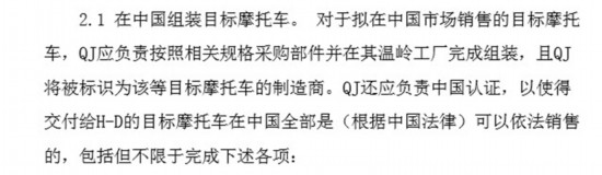 按協(xié)議,雙方將為中國和亞洲其他市場共同開發(fā)兩種不同的哈雷品牌優(yōu)質(zhì)摩托車:第一款暫時定為338cc排量(以下簡稱為目標(biāo)摩托車);在目標(biāo)摩托車的制造和組裝以及供應(yīng)鏈優(yōu)化方面進行合作;在中國和亞洲其他市場銷售和營銷目標(biāo)摩托車進行合作。