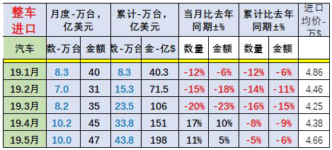 從進口額來看,5月汽車進口額為46.5億美元,同比增長4.6%;1-5月,汽車進口額為197.2億美元,同比下降6.3%。