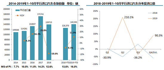 相比之下,平行進(jìn)口市場(chǎng)則實(shí)現(xiàn)逆勢(shì)上揚(yáng)。1-10月,平行進(jìn)口汽車?yán)塾?jì)進(jìn)口14.0萬輛,同比增長(zhǎng)11.0%,占進(jìn)口總量的16.0%,創(chuàng)歷史新高。流通協(xié)會(huì)認(rèn)為,這主要是受國(guó)六實(shí)施等政策的影響。