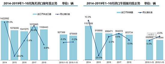 同比微降2.0%,降幅相比2018年收窄3.6個(gè)百分點(diǎn)。其中,受2018年關(guān)稅稅率下調(diào)和國(guó)六實(shí)施影響,進(jìn)口車銷量大起大落,在二季度增長(zhǎng)22.1%之后,市場(chǎng)再次進(jìn)入下行通道。