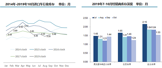 10月,進(jìn)口車經(jīng)銷商庫(kù)存深度為1.4個(gè)月,較前兩個(gè)月微升,但仍處于合理區(qū)間;行業(yè)全鏈條庫(kù)存回落到3.5個(gè)月,是近五年同期的最低點(diǎn)。流通協(xié)會(huì)方面認(rèn)為,今年進(jìn)口車庫(kù)存合理是供需雙降引起的,與2015-2016年去庫(kù)存導(dǎo)致的庫(kù)存合理有本質(zhì)區(qū)別。
