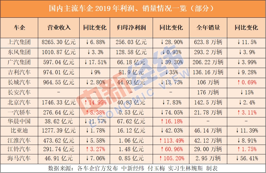2019年車企成績單出爐,中新經(jīng)緯記者經(jīng)統(tǒng)計(jì)發(fā)現(xiàn),營收、凈利雙降幾乎成了各大主流車企的趨勢。而少數(shù)逆勢扭虧為盈者,或因變賣資產(chǎn)、或因收巨額補(bǔ)貼等均非主業(yè)所得……梳理得知,市場疲軟及銷量下滑是車企對全年表現(xiàn)不盡如人意的普遍解釋。