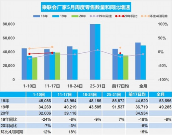 乘聯(lián)會20日發(fā)布的數據顯示,5月第二周(11-17日)的乘用車市場零售表現(xiàn)改善,環(huán)比增長18%,相對前期5月第二周的環(huán)比增長放緩的情況,今年的5月零售走勢回暖的態(tài)勢明顯。