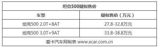 此次曝光的疑似售價(jià)中,還曝光了坦克500將搭載2.0T+8AT變速箱車型,這一點(diǎn)與此前的消息不太吻合。此前曝光,坦克500將搭載長(zhǎng)城最新的3.0T+9AT變速箱,疑似售價(jià)為33.8-38.8萬元。而2.0T+8AT車型的推出更多的是降低坦克500車系的售價(jià),將其起售價(jià)下降至30萬元以內(nèi),哈弗H9已經(jīng)迎來的中期改款,售價(jià)為21.48-37.98萬元,同樣搭載了2.0T+8AT動(dòng)力,如果動(dòng)力相同哈弗H9不香嗎?