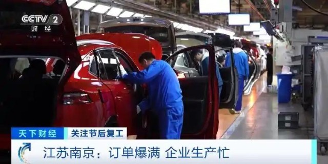 在南京市江北新區(qū)的一家大型汽車生產(chǎn)企業(yè),其中一個(gè)車間面積4萬平方米,產(chǎn)線從腳下延伸到了頭頂,工作人員正在緊張忙碌著,一輛輛嶄新的汽車高效地走向流水線。這里每天可以生產(chǎn)汽車1000輛左右。一些剛剛上市的新款新能源汽車產(chǎn)品,銷售非?;鸨?,訂單已經(jīng)排到了今年下半年。正月初五這里已經(jīng)全員在崗趕訂單。這個(gè)車間,每天兩個(gè)班組,1200多名工人日夜在崗,這個(gè)數(shù)字是去年春節(jié)同期的2.5倍。