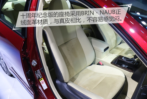 十周年紀(jì)念版凱美瑞將原本就已經(jīng)是真皮包裹的座椅更換了“新裝”,采用了最新研發(fā)的BRIN?NAUB材質(zhì)的正絨面革。與真皮材質(zhì)相比,這種全新的材料不容易有悶的感覺,夏天的時(shí)候不會越坐越熱。冬天的時(shí)候,剛坐進(jìn)車?yán)镆膊粫杏X特別涼,這樣直接省去了再配坐墊的麻煩。BRIN?NAUB材質(zhì)還具有更好的彈性和延展性,長期坐壓之后不易變形。