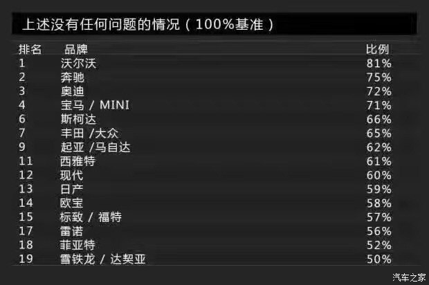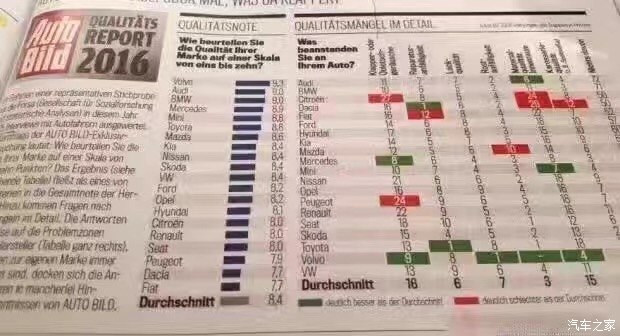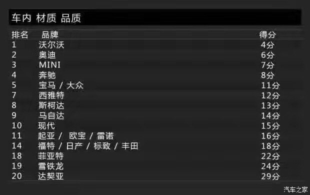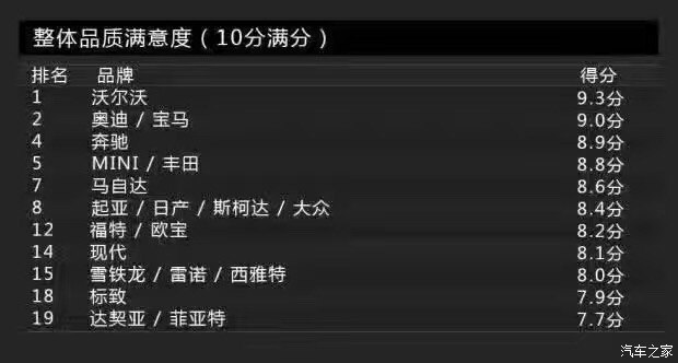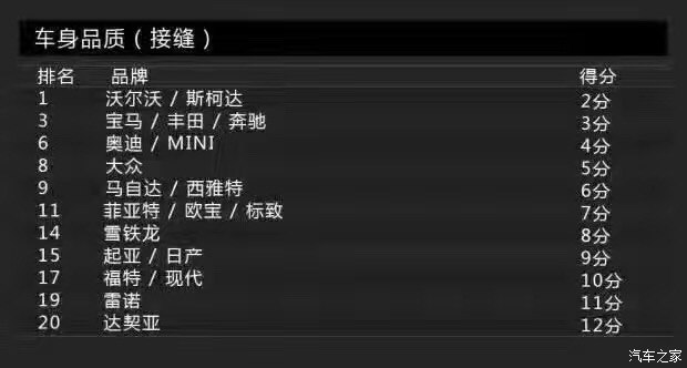 Bild調(diào)查的車身品質(zhì)(接縫)主要包括車身品質(zhì)、開關(guān)門的手感、鋼板接縫及經(jīng)常與身體接觸的地方。沒錯,這一單項表現(xiàn)最佳的是沃爾沃,得分為2分。這里小編要敲黑板提醒大家注意了:在車身品質(zhì)(接縫)滿意度上,得分最低表現(xiàn)最好。當(dāng)然,斯柯達(dá)也得到了2分,寶馬、奔馳則同為3分。而得分最高的就是前面提到的達(dá)契亞,它的得分是12分,換句話說就是達(dá)契亞是車身品質(zhì)滿意度最低的品牌。有意思的是與達(dá)契亞一起墊底是法系品牌雷諾,它的得分是11分。