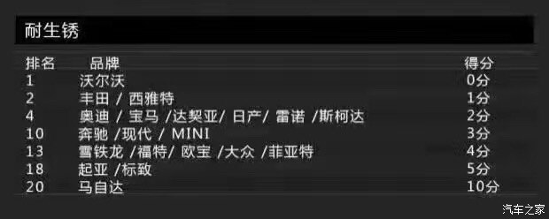 接下來這個項目的得分情況讓小編的心碎了一地,那就是耐生銹品質(zhì)。沃爾沃一如既往的穩(wěn)定,憑借0分的表現(xiàn)力挫群雄,險勝豐田及西雅特這兩個品牌。值得關(guān)注的是,這次的倒數(shù)第一名竟換成了馬自達(dá),日系得了10分實屬少見。本來小編就打算入手一臺阿特茲,看到這個表現(xiàn),立馬變得很猶豫了有木有!生銹,生銹,居然生銹?