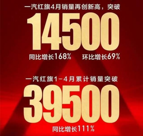 2019年,紅旗品牌累計(jì)銷量突破100000輛大關(guān),同比增長200%以上,銷量目標(biāo)比計(jì)劃提前了整整一年。然而,今年年初,一場突如其來的疫情,給全球汽車產(chǎn)業(yè)帶來了巨大的沖擊,大部分車企品牌銷量陷入一片下滑之中,而一汽紅旗卻逆勢而上,實(shí)現(xiàn)了超高增長。數(shù)據(jù)顯示,紅旗品牌4月份銷量14500輛,同比增長168%,環(huán)比增長69%;1—4月累積銷量突破39500輛,同比增長111%。