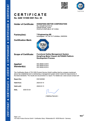 近日,東風汽車自主經(jīng)典AUTOSAR基礎軟件平臺開發(fā)流程成功獲得國際獨立第三方檢驗、檢測和認證機構(gòu)——TüV南德意志集團頒布的ISO 26262 ASIL-D級流程認證證書。這是東風汽車在智能網(wǎng)聯(lián)汽車核心軟件領域取得的重大突破,為構(gòu)建安全、可靠、智能的汽車電子生態(tài)提供了堅實保障。