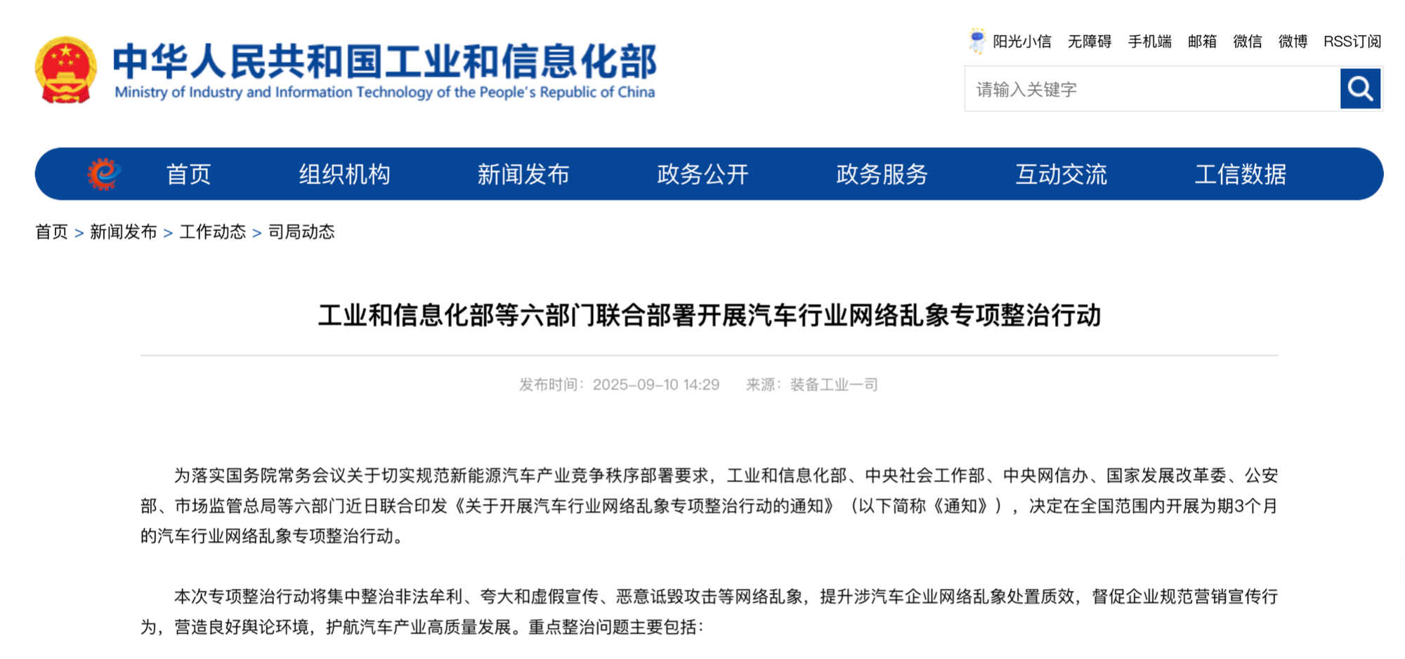 央廣網(wǎng)北京9月10日消息(記者董楠)9月10日,工業(yè)和信息化部(以下簡(jiǎn)稱“工信部”)、中央社會(huì)工作部、中央網(wǎng)信辦、國(guó)家發(fā)展改革委、公安部、市場(chǎng)監(jiān)管總局等六部門聯(lián)合印發(fā)《關(guān)于開(kāi)展汽車行業(yè)網(wǎng)絡(luò)亂象專項(xiàng)整治行動(dòng)的通知》,決定在全國(guó)范圍內(nèi)開(kāi)展為期3個(gè)月的汽車行業(yè)網(wǎng)絡(luò)亂象專項(xiàng)整治行動(dòng)。