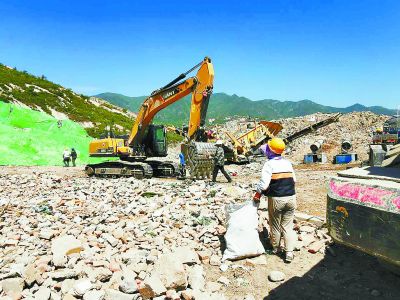 燕山鳳凰亭2號(hào)涵洞黑渣土場(chǎng)上,工人正在對(duì)建筑垃圾與生活垃圾進(jìn)行二次分揀。