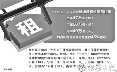 據(jù)了解,“十四五”期間,上海計劃新增保障性租賃住房47萬套(間)、廣州計劃新增60萬套(間)、深圳計劃新增40萬套(間),均占新增住房供應(yīng)總量的45%左右。北京正在編制“十四五”住房發(fā)展規(guī)劃,其中保障性租賃住房占比將不低于30%。杭州、西安“十四五”期間計劃新增保障性租賃住房均為30萬套(間),成都、廈門、武漢為25萬套(間),寧波、佛山為20萬套(間),濟南、福州、長沙、蘇州為15萬套(間),南京12.5萬套(間)。