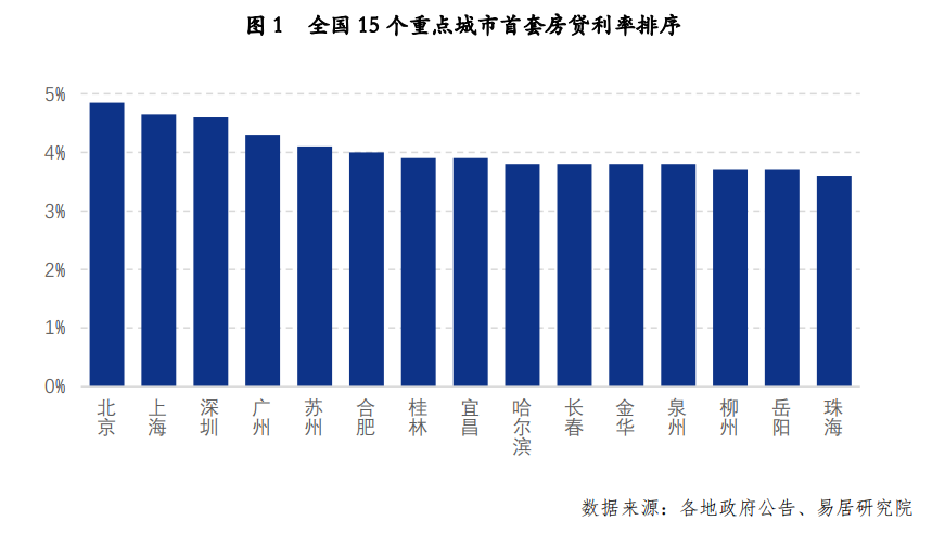 但具體看這15個城市的排序情況,各城市的實際首套房貸利率呈現(xiàn)了較大差異。其中北上深廣四個一線城市房貸利率最高,分別為4.85%、4.65%、4.60%和4.30%。而其他城市均低 4.1%的水平。易居房地產(chǎn)研究院統(tǒng)計顯示,有9個城市房貸利率低于4%的水平,包括弱二線城市和很多三四線城市。