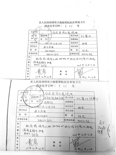 土地檔案中《國有土地使用權出讓審批卡片》與劉聚川提供的原件復印件對比。記者 朱旭東 攝