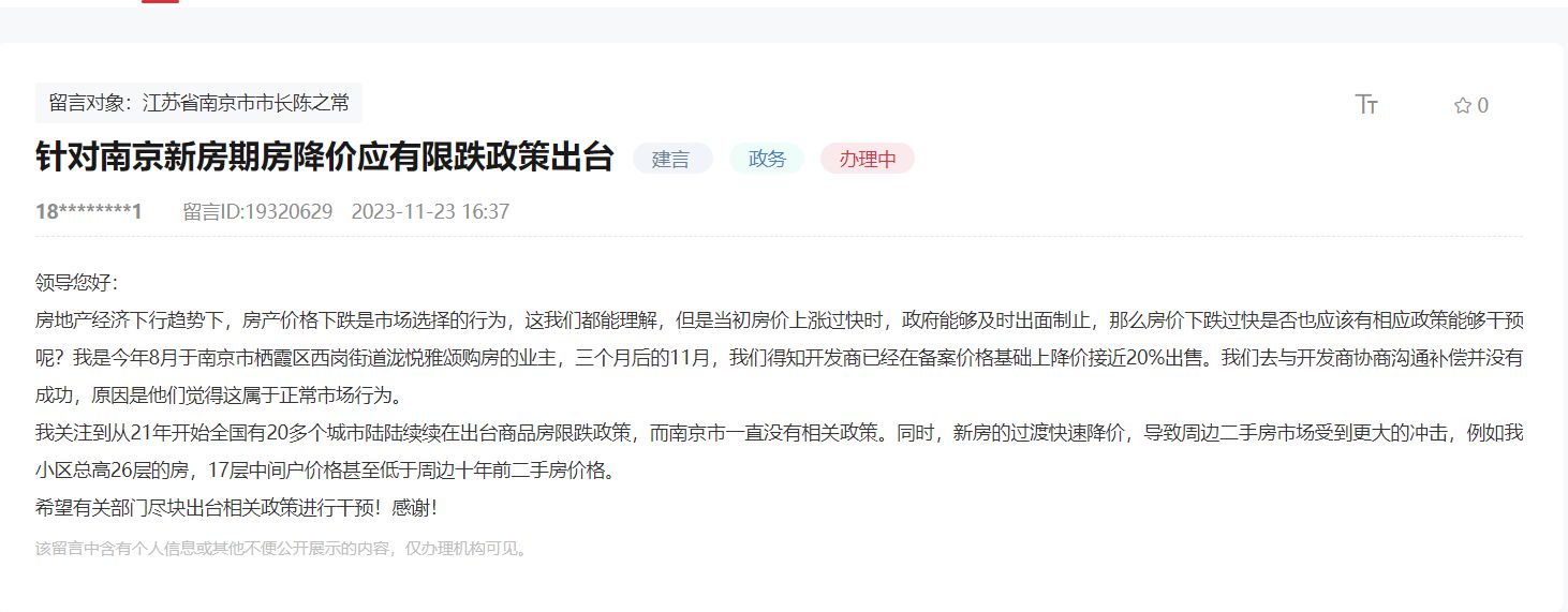 在領(lǐng)導(dǎo)留言板上,11月23日,有網(wǎng)友表示“針對南京新房期房降價(jià)應(yīng)有限跌政策出臺”。該網(wǎng)友留言道,“房地產(chǎn)經(jīng)濟(jì)下行趨勢下,房產(chǎn)價(jià)格下跌是市場選擇的行為,這我們都能理解,但是當(dāng)初房價(jià)上漲過快時,政府能夠及時出面制止,那么房價(jià)下跌過快是否也應(yīng)該有相應(yīng)政策能夠干預(yù)呢?我是今年8月于南京市棲霞區(qū)西崗街道瀧悅雅頌購房的業(yè)主,3個月后的11月,我們得知開發(fā)商已經(jīng)在備案價(jià)格基礎(chǔ)上降價(jià)接近20%出售。我們?nèi)ヅc開發(fā)商協(xié)商溝通補(bǔ)償并沒有成功,原因是他們覺得這屬于正常市場行為。 我關(guān)注到從21年開始全國有20多個城市陸陸續(xù)續(xù)在出臺商品房限跌政策,而南京市一直沒有相關(guān)政策。同時,新房的過度快速降價(jià),導(dǎo)致周邊二手房市場受到更大的沖擊,例如我小區(qū)總高26層的房,17層中間戶價(jià)格甚至低于周邊十年前二手房價(jià)格?!?/p>