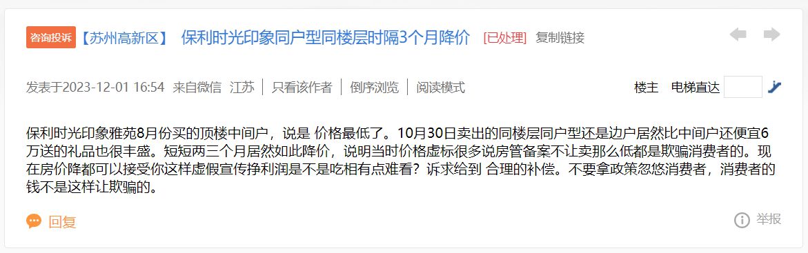 澎湃新聞在蘇州陽光便民網(wǎng)上看到,12月1日,有網(wǎng)友留言表示:蘇州高新區(qū)保利時光印象雅苑項(xiàng)目,“8月份買的頂樓中間戶,說是價(jià)格最低了。10月30日賣出的同樓層同戶型還是邊戶,居然比中間戶還便宜6萬元,送的禮品也很豐盛。短短兩三個月居然如此降價(jià),說明當(dāng)時價(jià)格虛標(biāo)?!?/p>