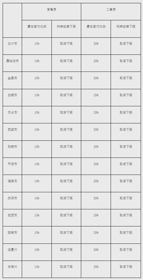 中新網5月24日電 據(jù)中國人民銀行甘肅省分行網站消息,甘肅省全面優(yōu)化住房信貸政策,蘭州等14市州首套、二套房貸利率政策下限全部取消,最低首付比例分別下調至15%和25%。