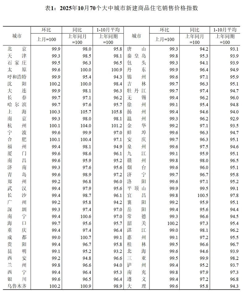 據(jù)國家統(tǒng)計(jì)局?jǐn)?shù)據(jù),10月份,一線城市新建商品住宅銷售價(jià)格環(huán)比下降0.3%,降幅與上月相同。其中,上海上漲0.3%,北京、廣州和深圳分別下降0.1%、0.8%和0.7%。二線城市新建商品住宅銷售價(jià)格環(huán)比下降0.4%,降幅與上月相同。三線城市新建商品住宅銷售價(jià)格環(huán)比下降0.5%,降幅擴(kuò)大0.1個(gè)百分點(diǎn)。