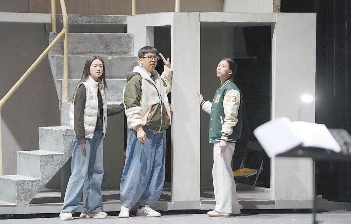 李佳軒(中)在給兩位演員說(shuō)戲。北京日?qǐng)?bào)記者 方非攝