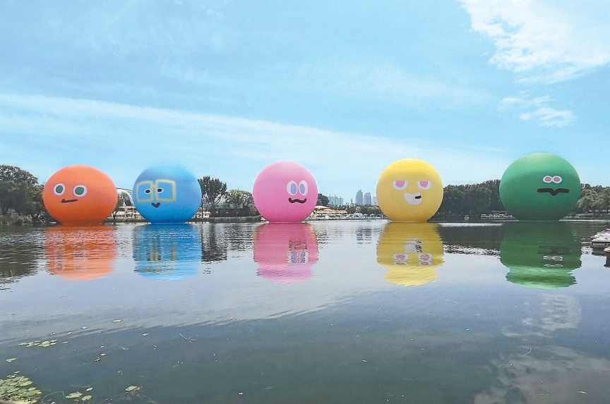 近日,朝陽公園北碼頭附近的湖面上新添五個10米高的充氣大球,粉色、黃色、綠色等不同顏色,對應的是樂隊組合五月天的不同成員,也與今年7月25日至8月9日,五月天在鳥巢舉辦演唱會的舞臺裝置遙相呼應。與此同時,樂隊成員的人物公仔也分別放置在居庸關(guān)長城、首鋼園、鼓樓廣場、798·751藝術(shù)區(qū)、亮馬河畔等地標景點。