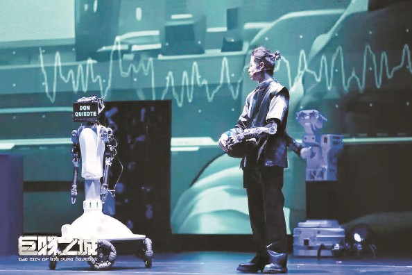 這是國(guó)內(nèi)首部機(jī)器人戲劇《巨物之城》的演出現(xiàn)場(chǎng)。演員與機(jī)器人一同完成了80分鐘的表演,謝幕后,臺(tái)下觀眾涌上舞臺(tái),爭(zhēng)相與“堂吉訶德”“麒麟臂”“嵐”等機(jī)器人合影、問好。機(jī)器人——這個(gè)在日常生活中還頗為“遙遠(yuǎn)”的形象,第一次以情感表達(dá)者的身份,走近了普通觀眾。