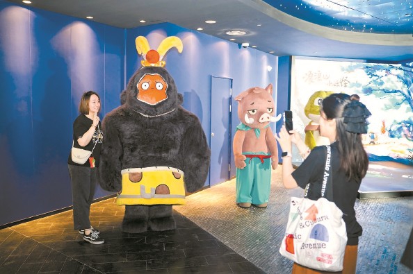 從走出軌交徐家匯站的那一刻起,“浪浪山”主題燈箱便接連映入眼簾,悄然揭開(kāi)這個(gè)奇幻宇宙的序幕;美羅城商場(chǎng)球幕上的“小豬妖”頭像和“這條路走對(duì)了”的標(biāo)語(yǔ),引人駐足眺望;走進(jìn)“大王洞”觀影,挑選三五周邊玩偶、精美文創(chuàng)產(chǎn)品,在360°環(huán)形劇場(chǎng)聽(tīng)一場(chǎng)“浪浪山開(kāi)放麥”,在“豬媽媽茶水站”來(lái)一杯飲料……這趟沉浸式體驗(yàn)豐富而圓滿(mǎn)。