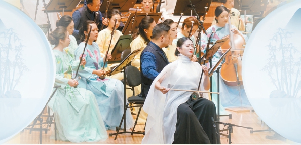 演出由知名華人指揮家湯沐海執(zhí)棒,來自上海民族樂團(tuán)的70余位演奏家一同奏響華章。“海上生民樂”分音樂會版和上海音樂廳駐場版,前者偏向西方當(dāng)代交響音樂會的制式,后者則融入多媒體光影,更傾向于沉浸式音樂現(xiàn)場。因而,曲目會根據(jù)現(xiàn)場環(huán)境和觀眾特征做適當(dāng)調(diào)整。國外演出時(shí),會增加二胡與樂隊(duì)合奏的《臥虎藏龍》(見上圖)——這是東西方觀眾都熟悉,甚至?xí)谘矍案‖F(xiàn)出竹林搖曳畫面的曲目。音樂會版在編曲上的處理會在尾聲處以漸強(qiáng)手法處理中西樂器的合奏共鳴,把情感推向高潮。琵琶、京胡與樂隊(duì)合奏的《楚漢》中,俞冰的琵琶獨(dú)奏氣勢不凡,凸顯出西楚霸王的威武。嗩吶與樂隊(duì)合奏《鳳舞》時(shí),胡晨韻不僅能吹出一個(gè)超乎常人想象的長音,還能與笛子手等一起營造一群鳥兒的生動“對話”,時(shí)而平和時(shí)而激動,惹得觀眾忍俊不禁。而改編自膾炙人口的《野蜂飛舞》的民樂重奏《蜂飛》則賦予俄羅斯作曲家里姆斯基-科薩科夫的經(jīng)典名曲“中華風(fēng)韻”——眼見著民族樂器在王音睿、趙臻、丁龍等掌控的打擊樂、笙和二胡的樂音中展現(xiàn)出妙趣橫生的“畫面”。而開場,金鍇與趙韻夢領(lǐng)銜的竹笛與樂隊(duì)合奏《湖光》則凸顯出江南文化的音樂聲色。