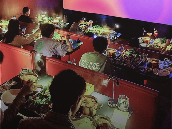 邊吃火鍋邊看電影,不只是在家里才能出現(xiàn)的場(chǎng)景,在三克映畫的電影院同樣能做到?!拔覀兿M麑⑷擞钞嫶蛟斐梢粋€(gè)集電影、美食、小型演出以及娛樂活動(dòng)等為一體的空間?!逼放苿?chuàng)始人韓春暉表示,通常情況下,在三克映畫放映的電影與院線同步,不過在和餐飲搭配的電影選擇上,也是有講究的。他說,影院通常會(huì)選擇放映一些比較輕松、娛樂性較強(qiáng)的電影。