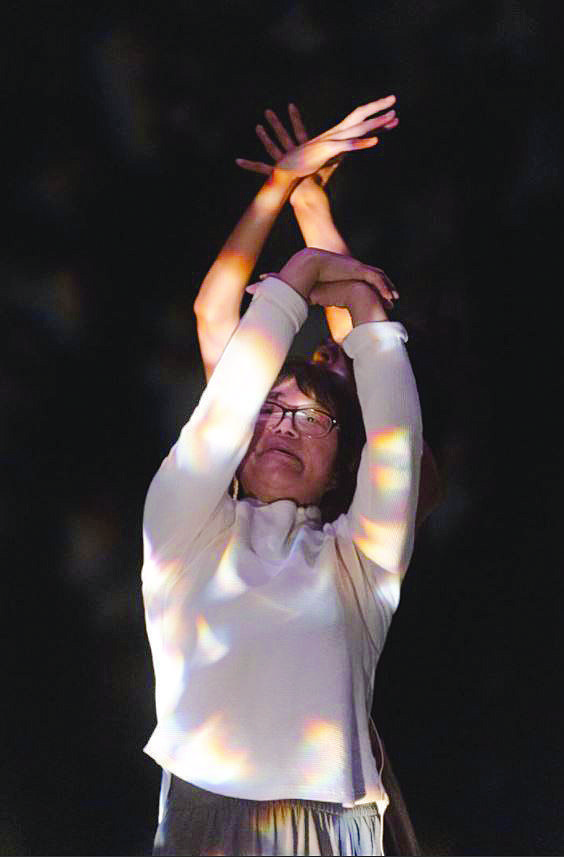 于是在《萬噸月色》的編排中,有兩名專業(yè)舞者圍繞著余秀華,她們分別隱喻著光明和陰影的意象,處在光明中的舞者美麗無瑕、人人向往,隱在陰暗中的舞者幽深難測、焦慮不安。這是對余秀華的內(nèi)心世界和她的詩歌意象的直觀再現(xiàn):這個傲視世俗偏見的詩人,也曾困惑于“他人的眼光”,她曾渴望光亮,害怕墜入暗淡,恰似她手持玫瑰登場,但這些花束變成砸向她的武器,而她的勇敢在于,在承受過偏見與傷害之后,她放下了“被認(rèn)可”的執(zhí)念,擁抱不完美的自己,自我和解。