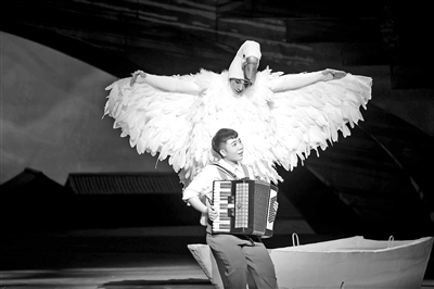 最具情趣的莫過于由北京京劇院武丑演員曹陽陽帶領(lǐng)一眾北戲?qū)W生演出的大鵝,身披潔白羽毛憨態(tài)可掬。這也是曹陽陽從藝以來第一次在舞臺(tái)上以動(dòng)物的形態(tài)進(jìn)行表演。這個(gè)與主角林大林互動(dòng)最多的角色,既要化身林大林渴望的父愛,又是他孤單時(shí)的玩伴。在模仿大鵝走路的過程中,曹陽陽便用上了京劇武丑的技巧。其中一場(chǎng)水中救人的段落,他甚至還要從兩米多高的橋上展開翅膀飛身下去,對(duì)京劇下高、空翻技巧有了全新的展示。