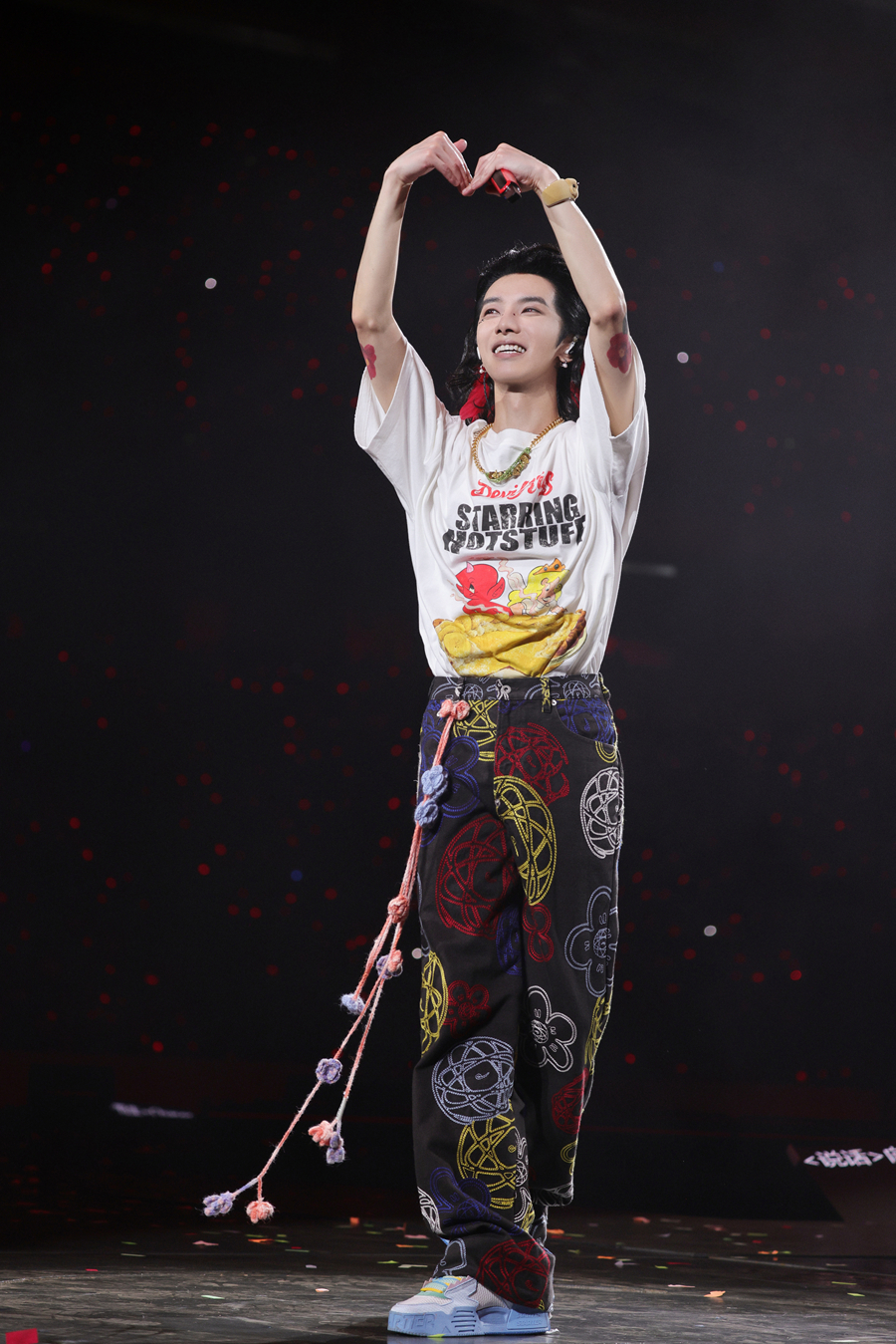 華晨宇在舞臺(tái)上說(shuō),“我的愿望是希望所有的火星人能在現(xiàn)在、還有未來(lái)可以一直都幸福?!彼e起了精心準(zhǔn)備的飯撒牌,繞場(chǎng)足足6分鐘,與四面臺(tái)的所有歌迷互動(dòng),飯撒牌上寫(xiě)著,“火星人,感到幸福就比心”“愛(ài)有多深刻”。