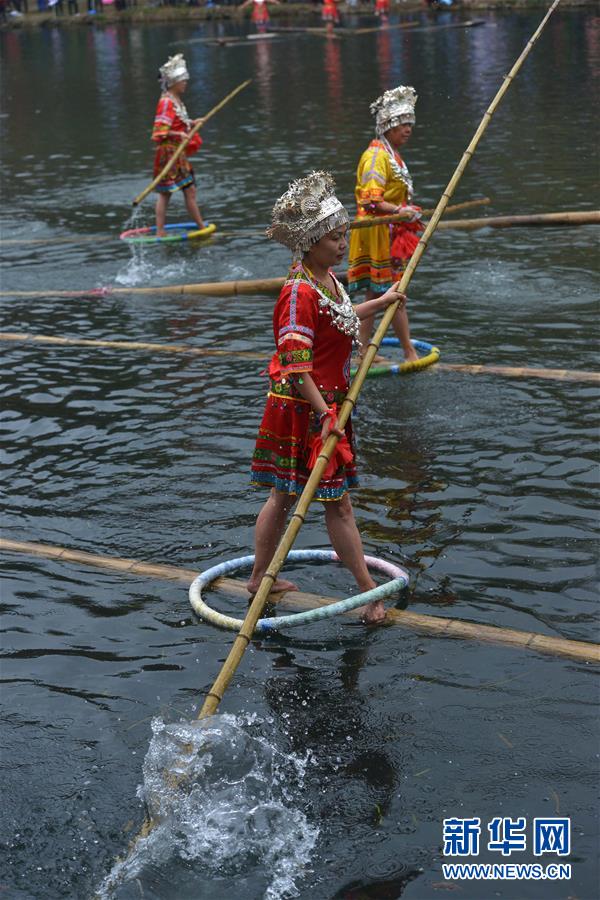 1月1日,“獨竹漂”愛好者在花溪河上表演水上高難度平衡動作。 2016年元旦,在貴陽市花溪公園平橋河段舉行的貴陽市第31屆冬泳表演活動中,數(shù)十名“獨竹漂”愛好者在花溪河上腳踏漂浮的竹竿,表演“金雞獨立”、轉(zhuǎn)身平衡等高難度動作,讓觀眾大飽眼福。新華社發(fā)(秦剛 攝)