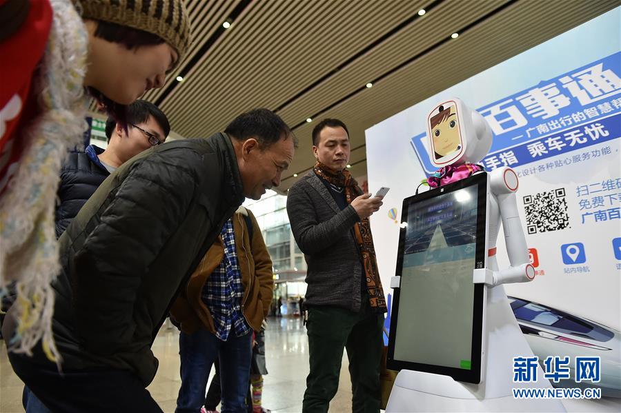 2月1日,旅客們在廣州南站與智能機(jī)器人“小璐”對話。當(dāng)日,一臺名叫“小璐”的智能機(jī)器人亮相廣州南站,吸引了大批旅客的圍觀,大家紛紛嘗試與“小璐”對話,向她咨詢列車時刻、購票信息、天氣情況等問題,“小璐”不僅可以用甜美的女聲一一作答,還可以在接收到語音指令后,為旅客“唱歌”和“跳舞”。據(jù)了解,使用智能機(jī)器人服務(wù)旅客是廣州南站在今年春運(yùn)中的新嘗試,如果試用效果良好,今后有望在車站中看到更多智能機(jī)器人的身影。新華社記者 梁旭 攝