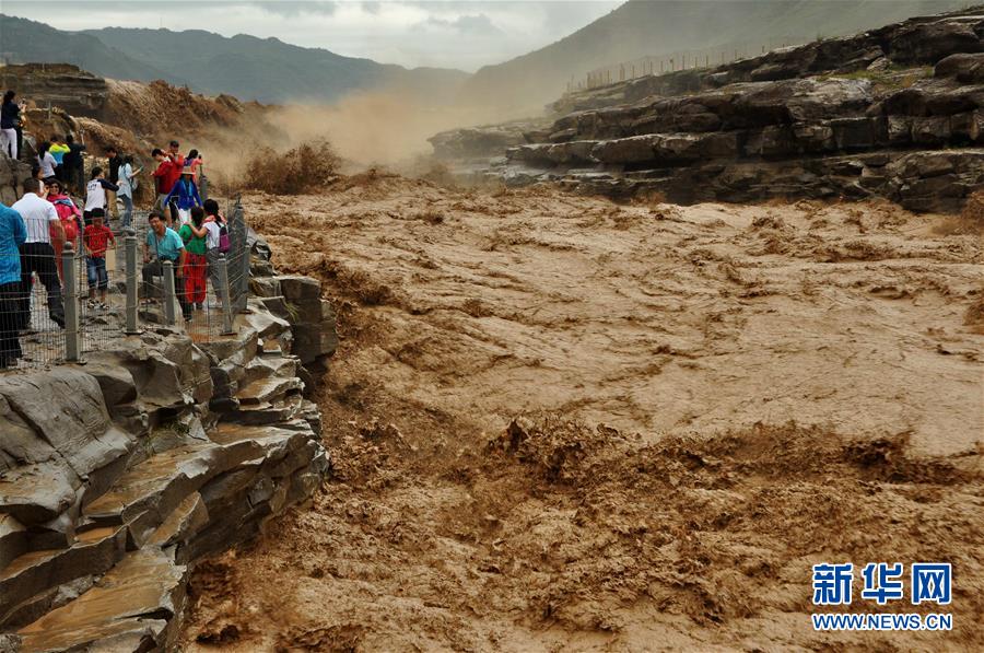 受上游強(qiáng)降雨影響,黃河壺口瀑布水勢大漲,主副瀑布連成一片。