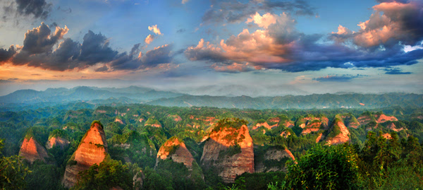 萬佛山地處云貴高原向南嶺山地的過渡地帶。經(jīng)數(shù)以億年的流水、風(fēng)化地質(zhì)作用,逐漸發(fā)育呈現(xiàn)出丹霞赤壁、石嶺、石寨、石柱、石橋、一線天、狹谷、溝巷等奇特的丹霞地貌自然景觀。域內(nèi)丹霞峰林拔地而起,巍巍陣列,尤如一幅天然水墨長卷。登臨萬佛山主峰山頂,俯視峰林,氣勢磅礴,向西南可望海神龜活神活現(xiàn);向北望毛蠟燭峰、天書巖、夫妻巖形象逼真;向南可遠(yuǎn)眺將軍山主峰及該將軍山景區(qū)螺絲峰和神仙洞景區(qū)大寨巖主峰及神仙山主峰。群峰列陣,萬佛朝宗,不愧為“丹霞群峰第一山”。