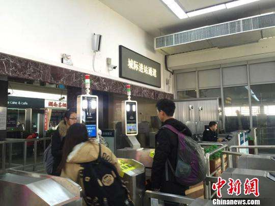 圖為長(zhǎng)沙火車站內(nèi)乘客通過(guò)“票證人自助核驗(yàn)閘機(jī)”“刷臉”進(jìn)站。(魯毅 攝)