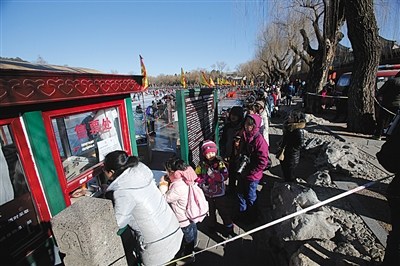 2月1日,北海冰場迎來客流高峰,售票處排起長隊(duì)。新京報(bào)記者 王飛 攝